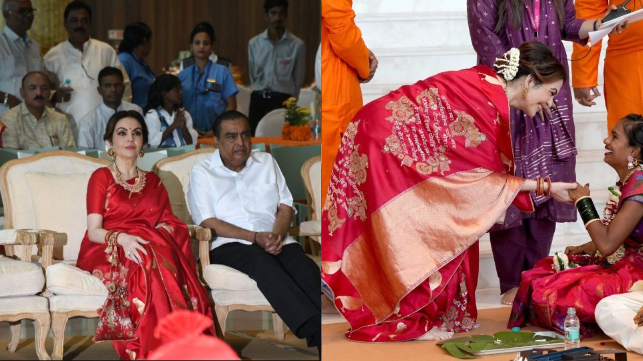 नीता अंबानी की साड़ी 'टॉक ऑफ दी टाउन' बनी हुई है. जब से ममेरू समारोह की तस्वीरें आई है तब से हर कोई अनंत अंबानी की मां की साड़ी की बात कर रहा है. दरअसल, इनकी साड़ी पर लिखे मंत्रों ने सबका ध्यान अपनी ओर खींचा है. रेड कलर की साड़ी जिसके पल्लू पर गायत्री मंत्र लिखा हुआ है.